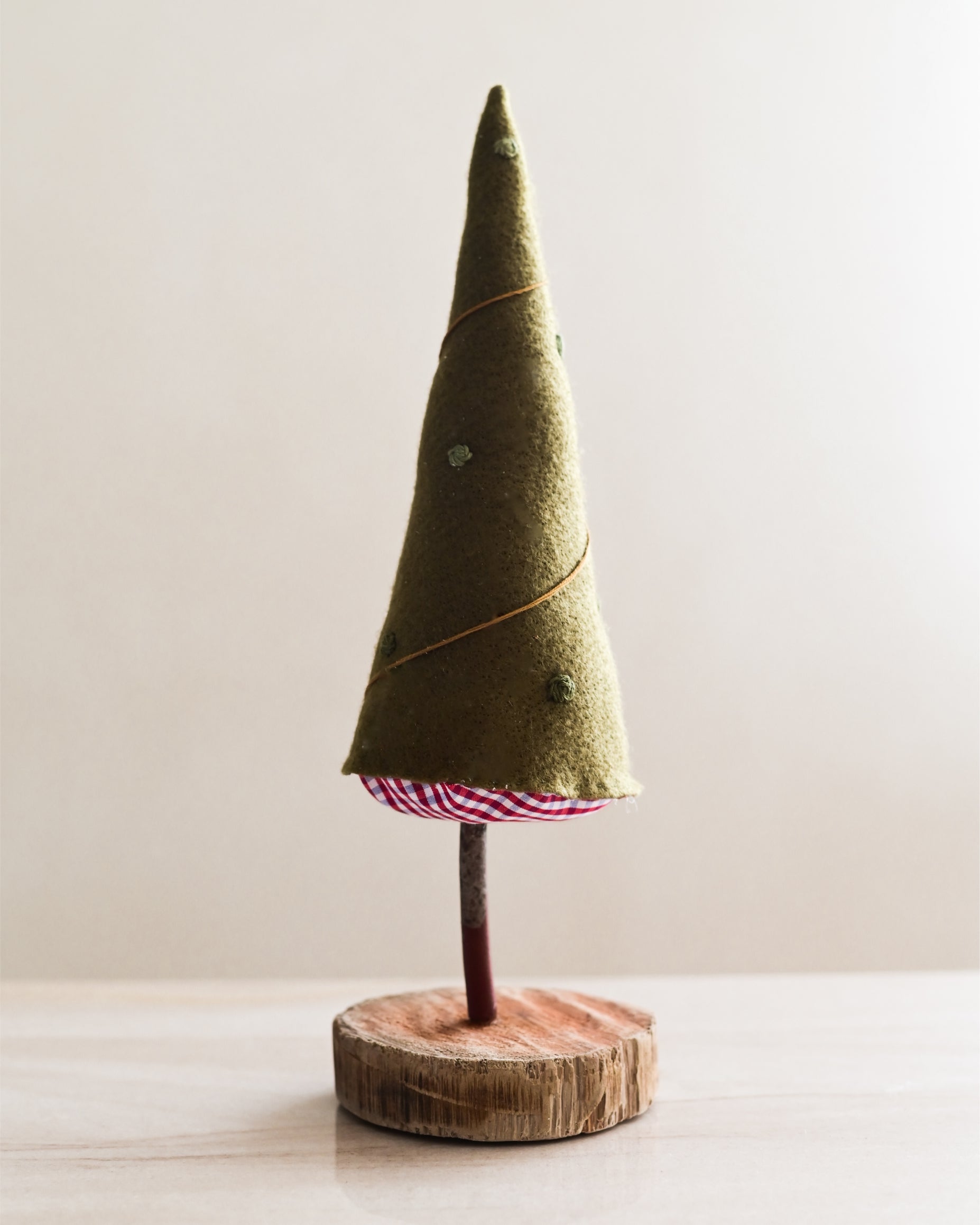Charmosa e original, esta árvore de Natal em tecido é feita artesanalmente com acabamento delicado e base em madeira. Com design exclusivo do Studio Garcia, une a beleza do feito à mão e sofisticação, trazendo um toque aconchegante e contemporâneo para a decoração de Natal. Ideal para enfeitar mesas, aparadores ou composições natalinas minimalistas, essa peça é perfeita para quem busca decoração sustentável, artesanal e autoral.