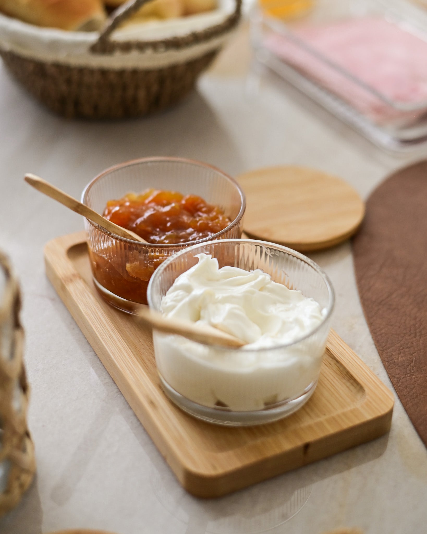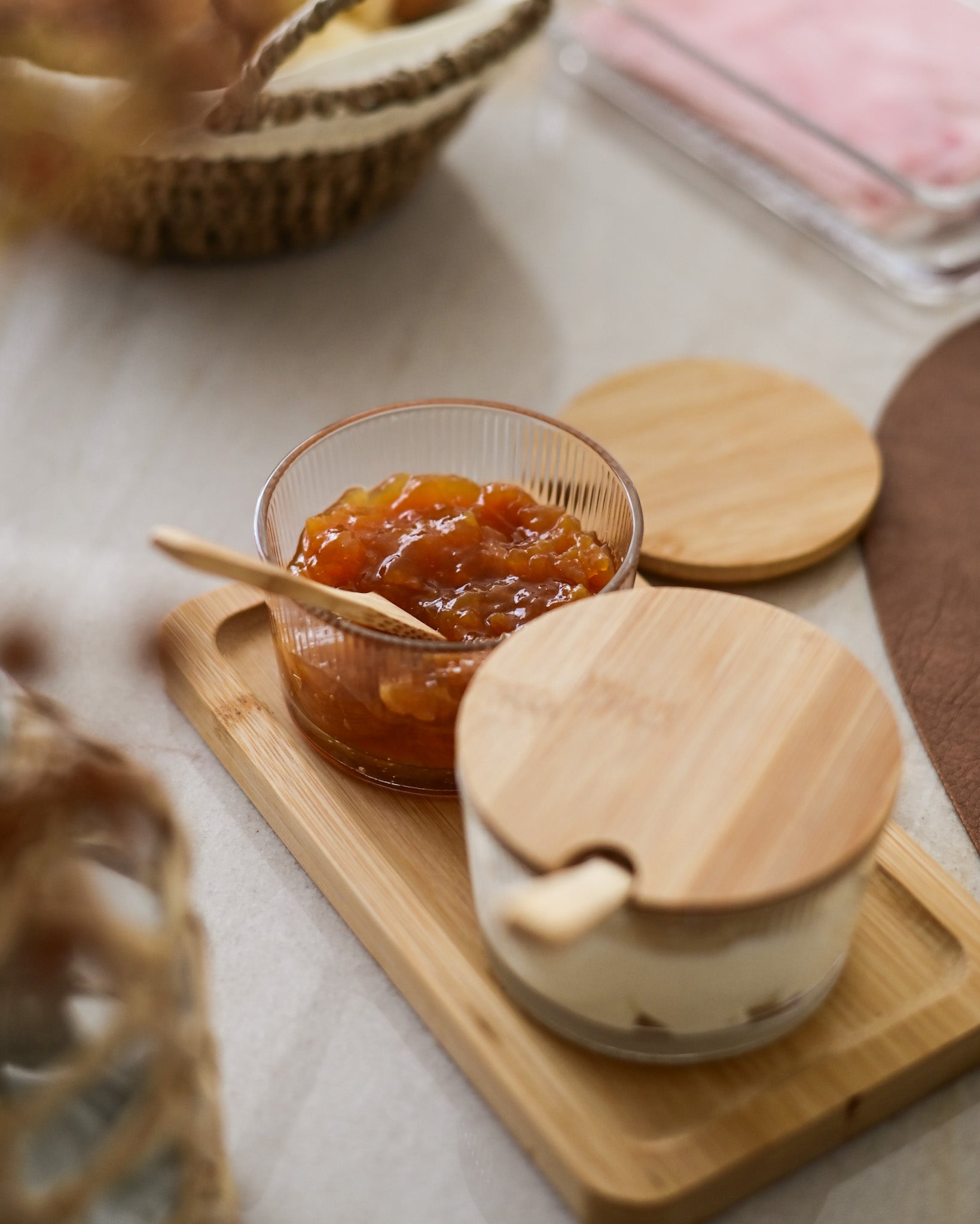 O conjunto de potes para geleia une praticidade, charme natural e design contemporâneo, perfeito para servir com elegância no café da manhã ou no chá da tarde. Composto por dois potes de vidro transparente, permite visualizar o conteúdo com facilidade, valorizando geleias, mel, compotas ou pastas. As tampas em bambu contam com abertura para a colher, garantindo praticidade no uso diário, enquanto as colheres também em bambu proporcionam um toque rústico e sofisticado. A base em bambu organiza as peças com harmonia, além de proteger a superfície e facilitar o transporte.