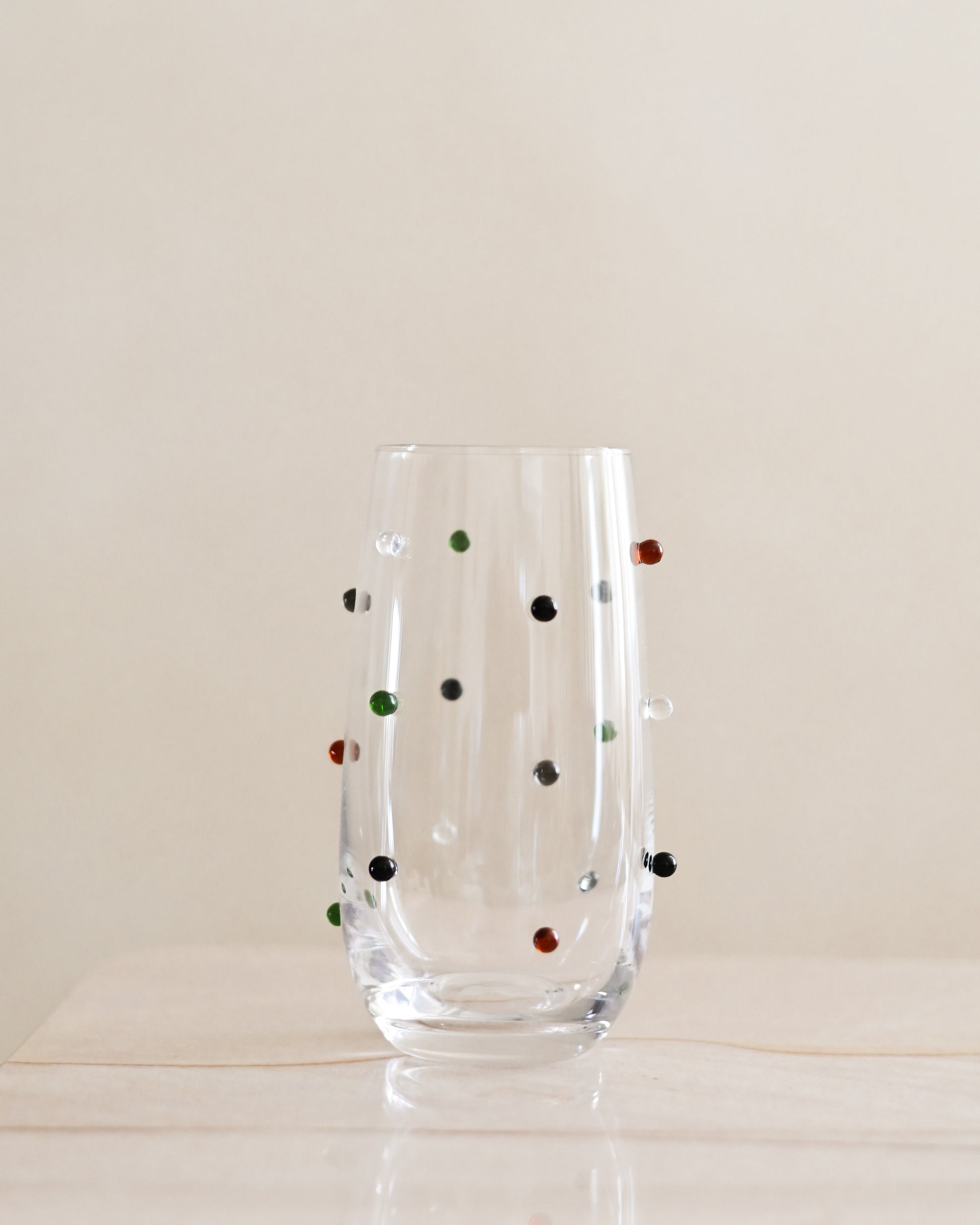 Este copo de vidro é perfeito para quem busca estilo e originalidade na hora de servir. Suas bolinhas coloridas em relevo — em diferentes tons que conversam entre si — trazem um toque artesanal e alegre à mesa posta, combinando charme e modernidade. Ideal para água, sucos ou drinks, ele transforma qualquer ocasião em um momento especial.