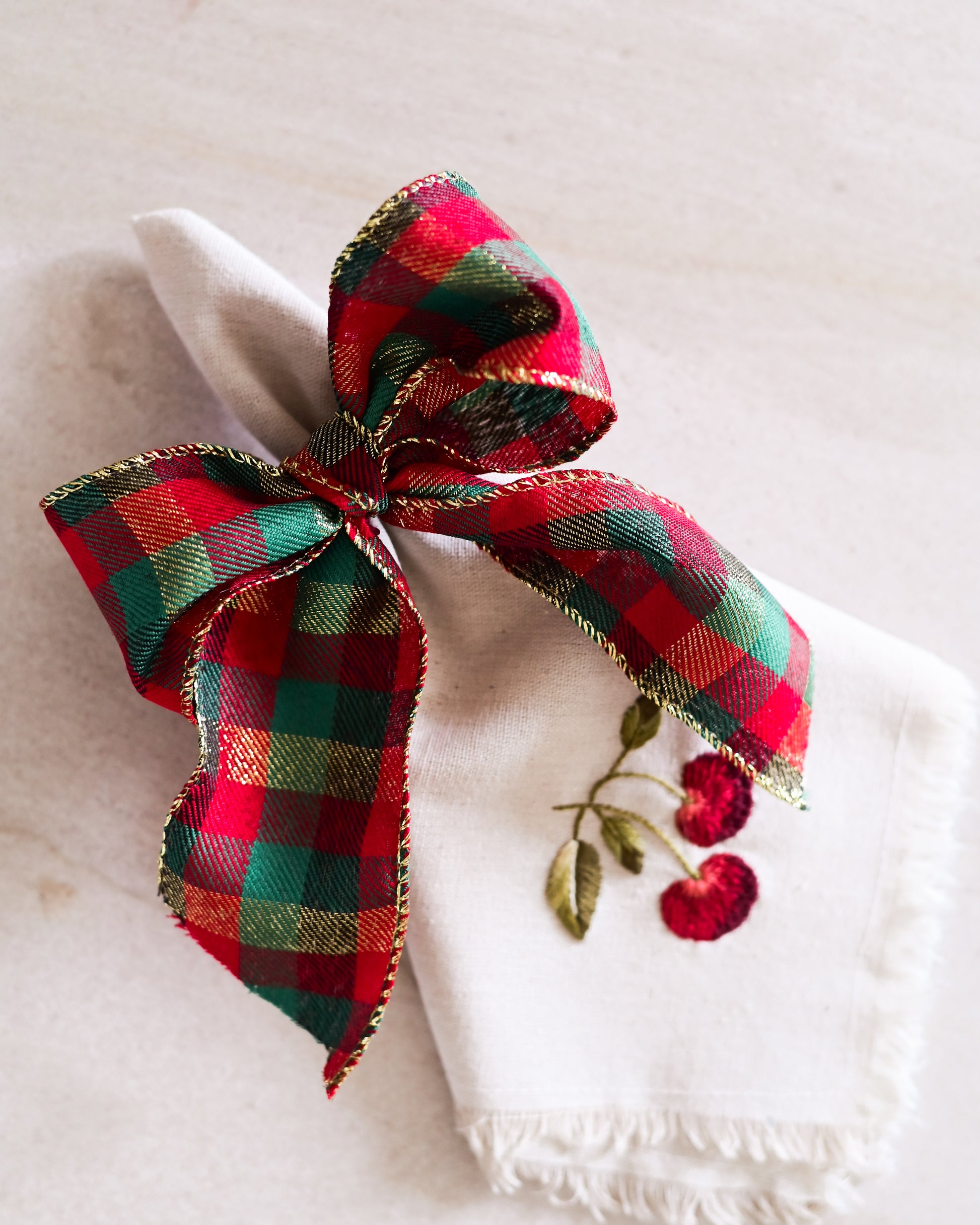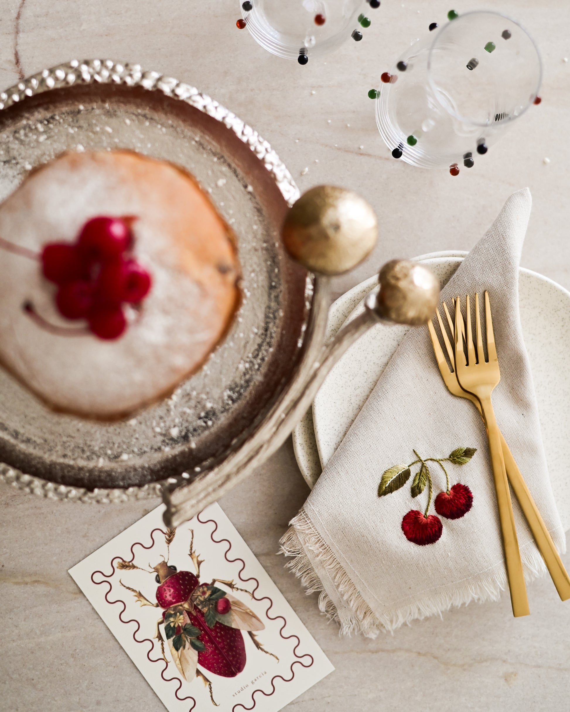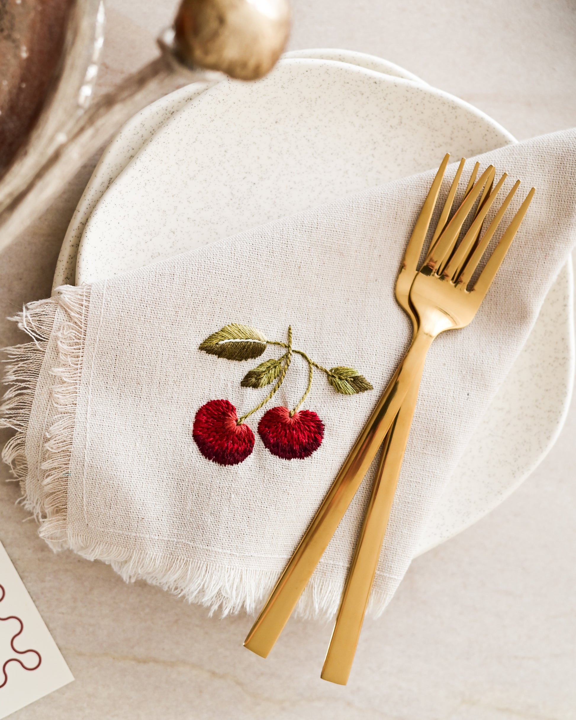 Conheça o nosso modelo de guardanapo em linho rústico personalizado para a data mais especial do ano. Bordado à mão, ele une a beleza do artesanal, com o toque lúdico do detalhe de cerejas e a rusticidade atemporal do tecido com bordas levemente desfiadas. De encantar os olhos, a mesa e seus convidados. Construído artesanalmente em todas as etapas, garante autenticidade e elegância despretensiosa para a sua mesa. Você pode utilizá-lo de diversas maneiras combinando com o seu estilo.