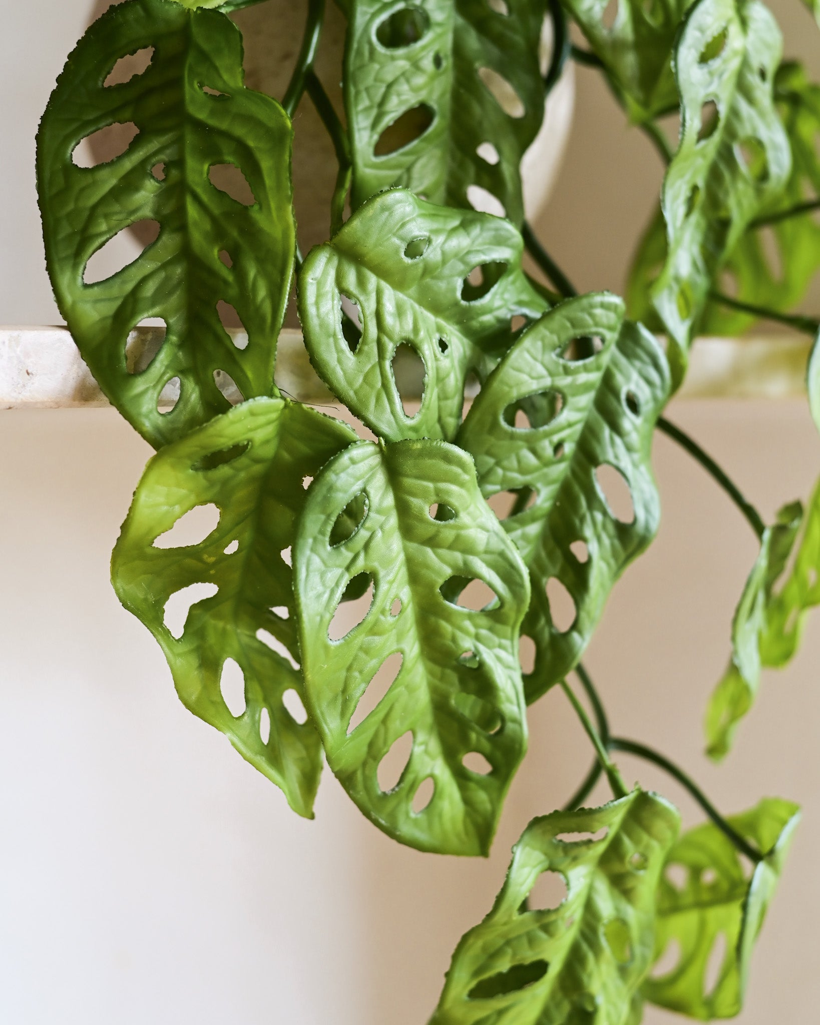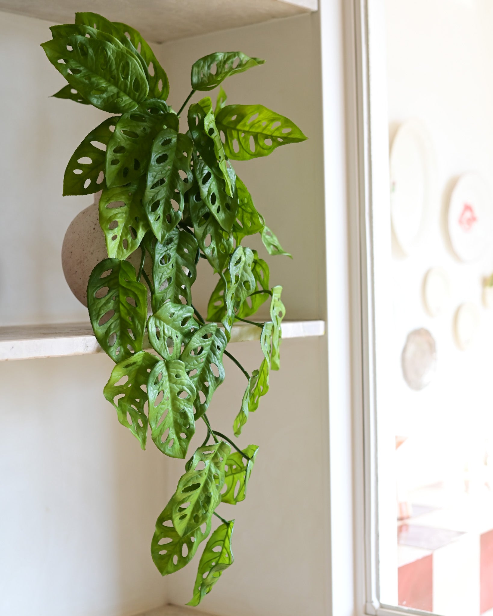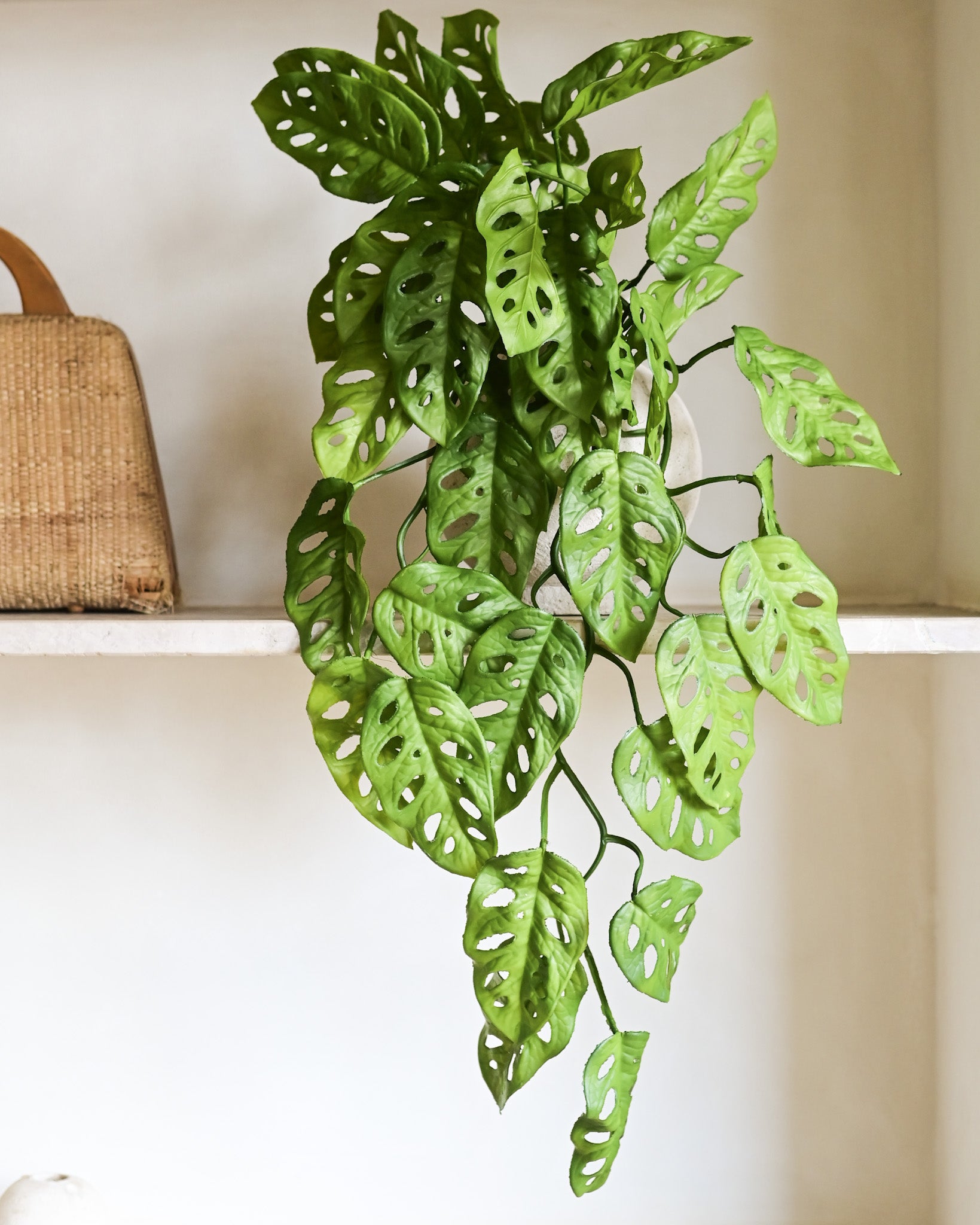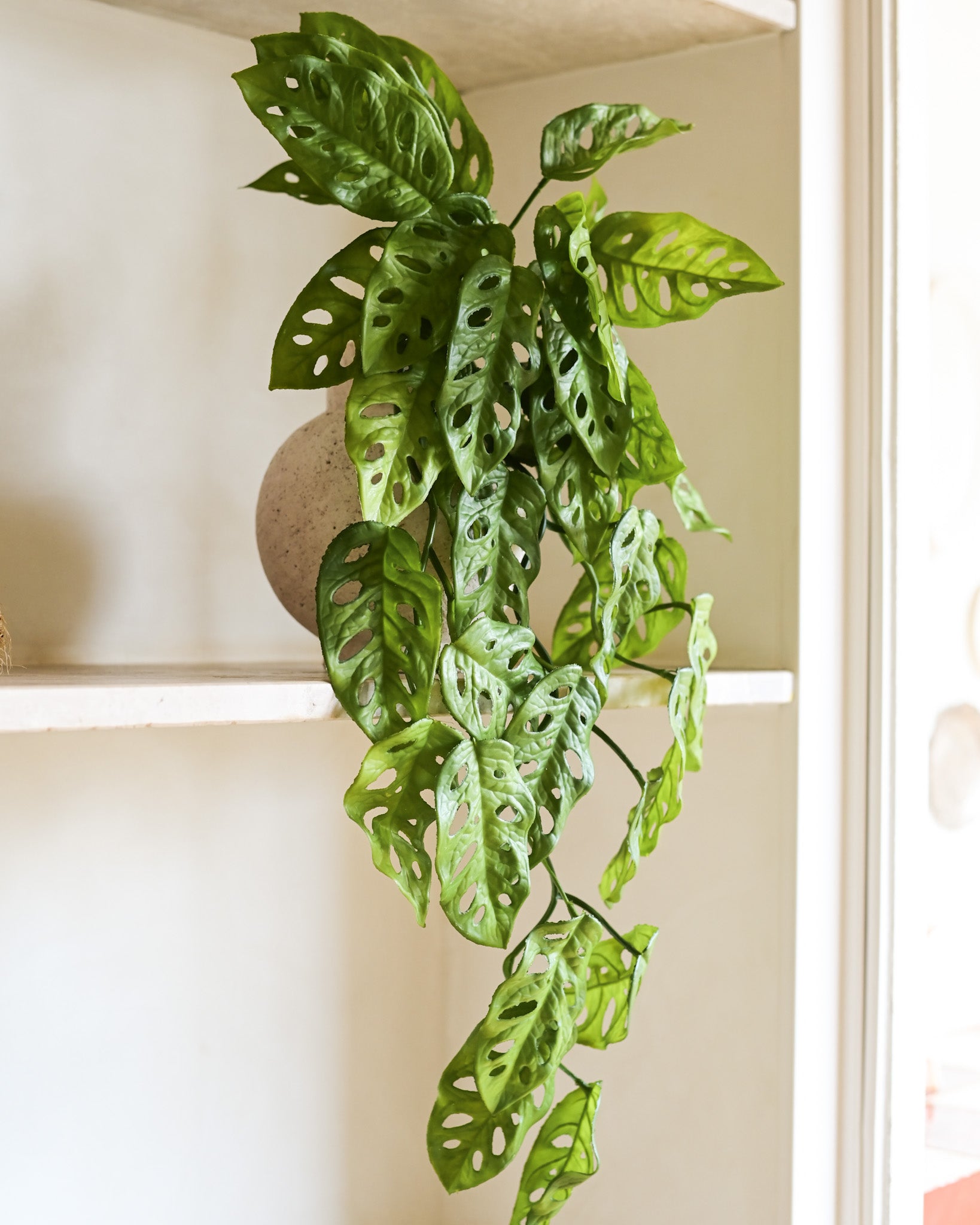 A Haste Pendente Monstera Permanente é perfeita para criar uma decoração tropical moderna e elegante. Com folhas recortadas e vazadas, reproduz o visual marcante da monstera, trazendo leveza e movimento às composições. Ideal para uso em prateleiras, nichos, vasos suspensos e jardins verticais, seu efeito pendente cria um caimento natural e sofisticado. Uma excelente opção de folhagem artificial decorativa, que adiciona frescor e estilo ao ambiente sem necessidade de manutenção.
