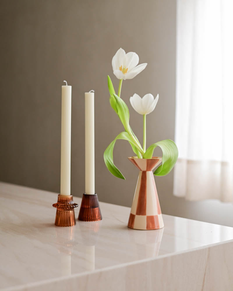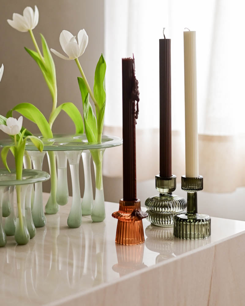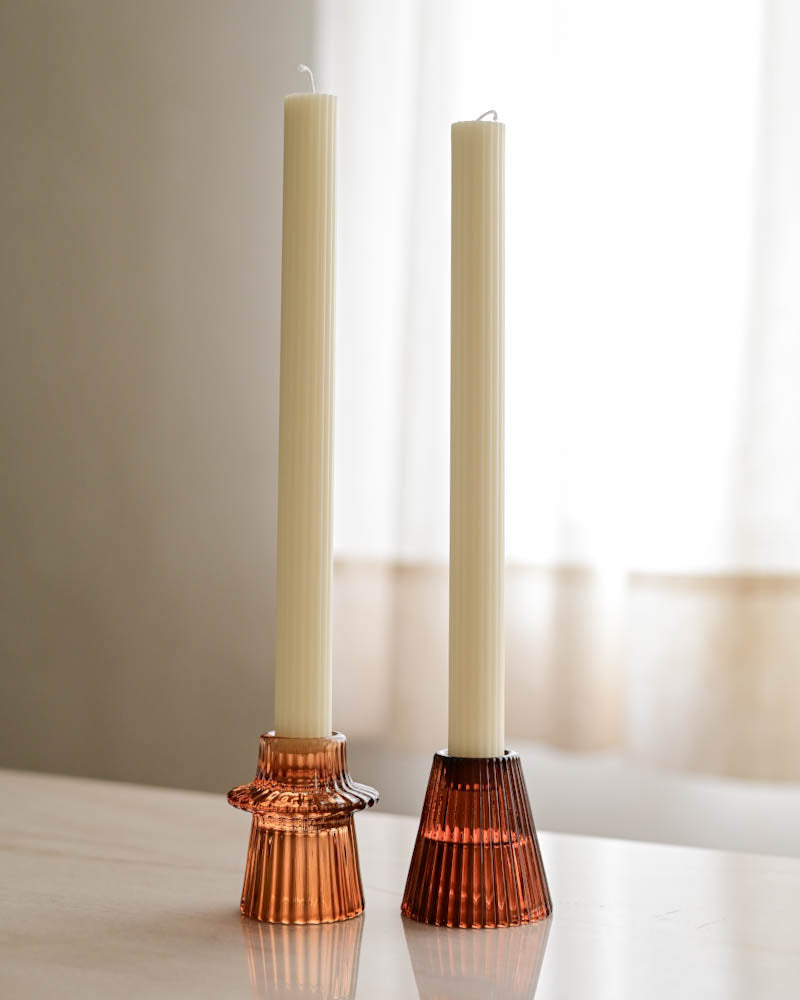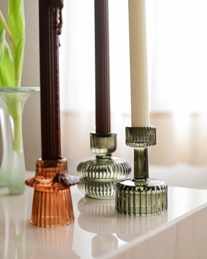 O kit com 4 castiçais canelados em vidro é super versátil para decoração e mesa posta. Com design atemporal e acabamento canelado, as peças combinam tons âmbar e fumê que trazem equilíbrio, charme e elegância à composição. As diferentes formas e cores permitem diversas possibilidades de uso, tanto em conjunto quanto separadamente, valorizando mesas de jantar, aparadores, mesas laterais e produções decorativas para o dia a dia ou ocasiões especiais. Um conjunto que se adapta facilmente a estilos modernos, contemporâneos e clássicos, sendo uma escolha certeira para quem busca funcionalidade, beleza e personalidade na decoração.