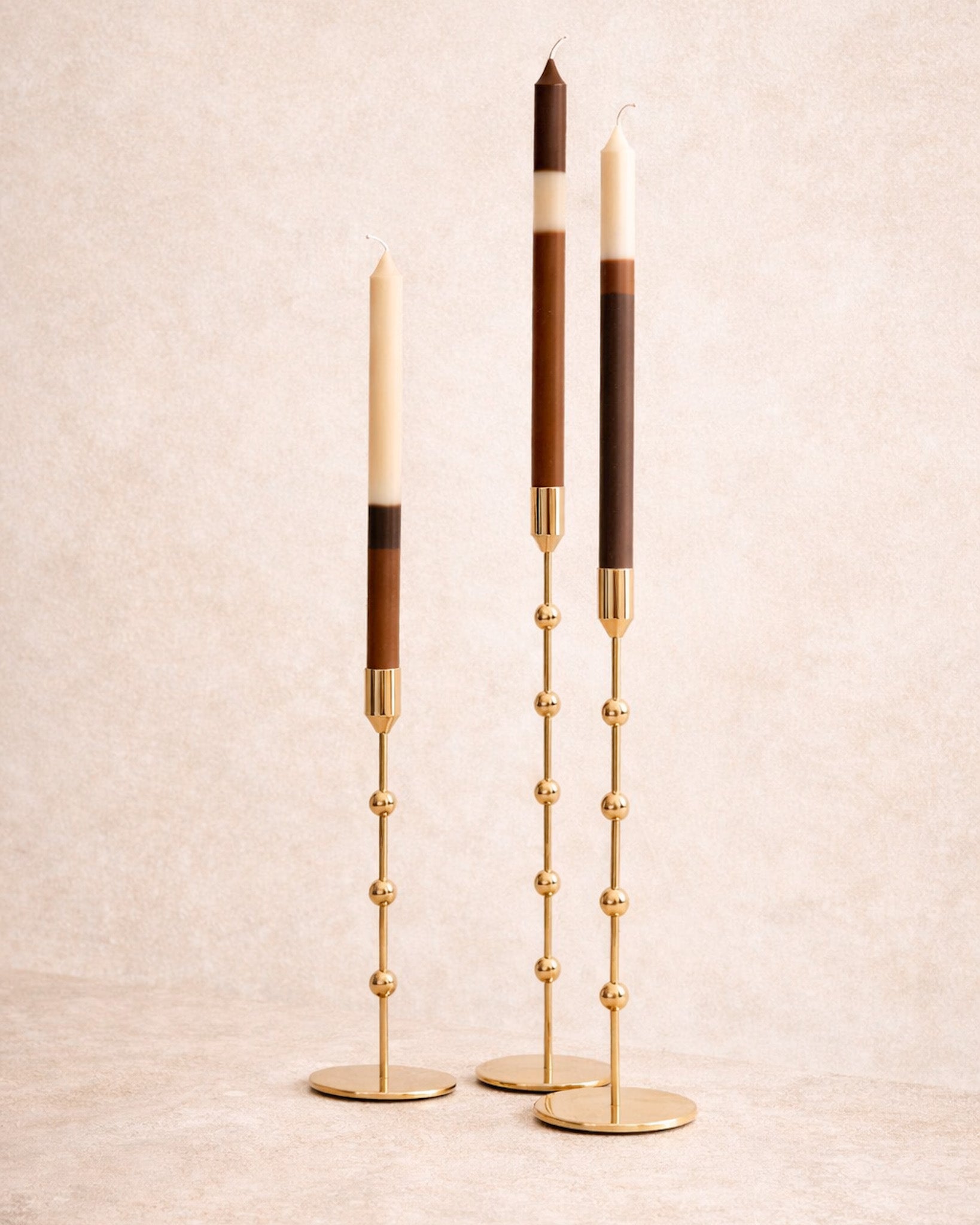 Trio de Castiçais Esferas em Dourado – Elegância e sofisticação para decorar sua casa. Com design moderno em metal dourado e detalhes em esferas, este conjunto de castiçais é perfeito para velas longas, ideal para compor o décor, além de agregar diferentes estilos de mesa posta e eventos especiais. Decoração com brilho e charme atemporal.