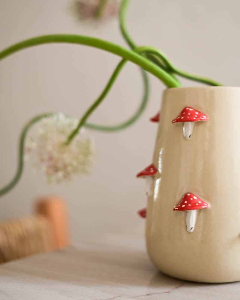 Delicado e bem humorado: Estamos vivendo em uma era da busca de mais alegria e descontração e isso se reflete na nossa casa! Esse vaso vai trazer ludicidade e poesia sem perder em sofisticação com formas orgânicas e seus cogumelozinhos, acabamento refinado todo feito à mão.